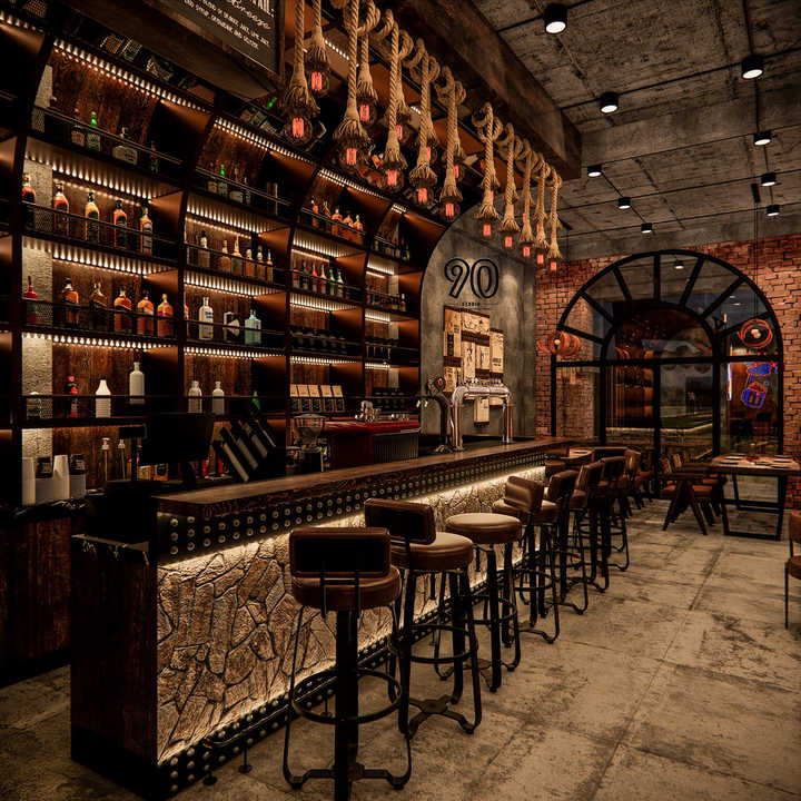 Aménagement intérieur de bar et de pub de style industriel, comptoir de bar, solutions complètes de rénovation et d'aménagement de bars commerciaux sur mesure