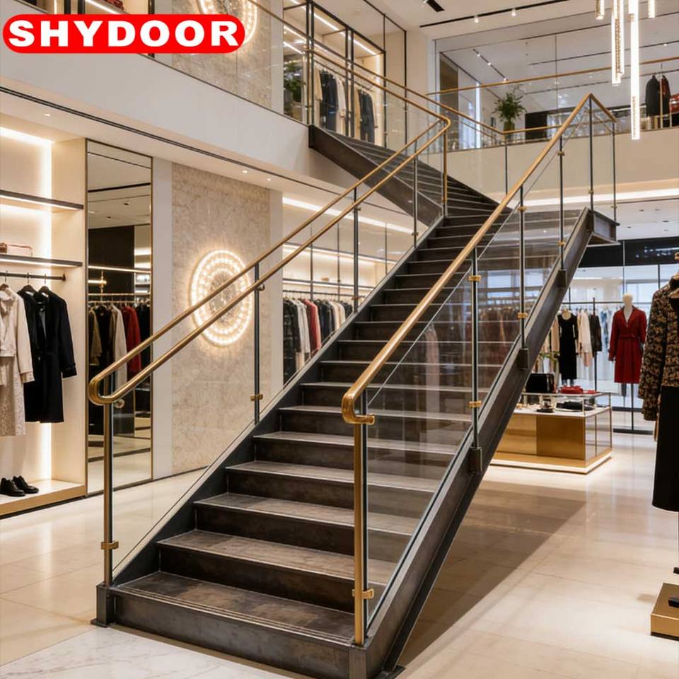 Rampe d'escalier sur mesure en acier inoxydable et verre de style industriel pour villa et centre commercial