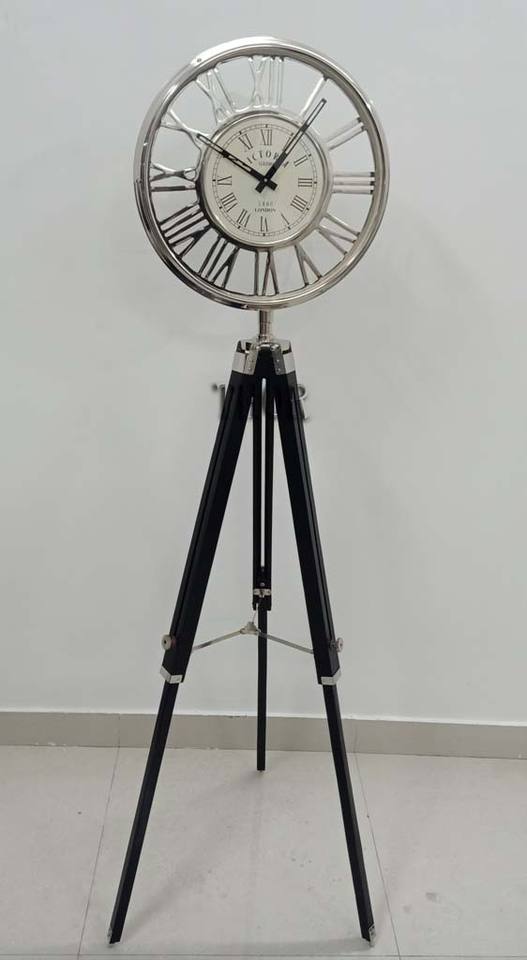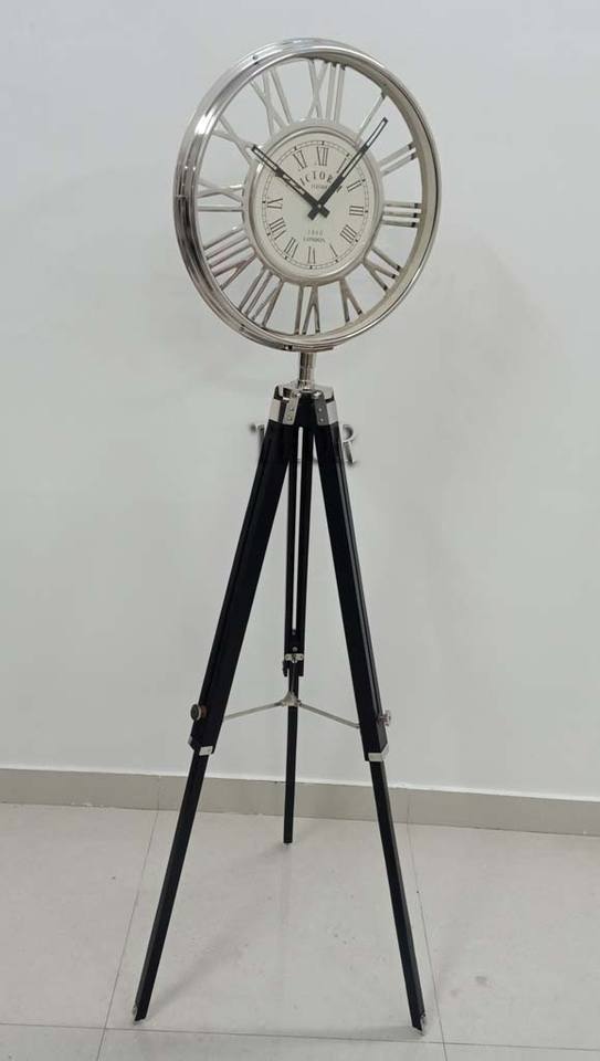 Horloge de sol à trépied industrielle, quartz, aiguilles, grands chiffres romains, design Art Déco, construction en bois, verre et acier, bon état, légère