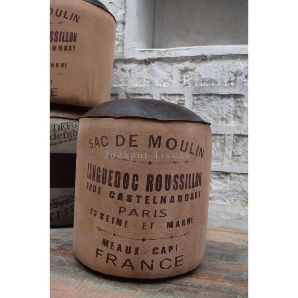 Pouf en cuir de toile de tabouret imprimé rond industriel et vintage pouf avec la conception unique