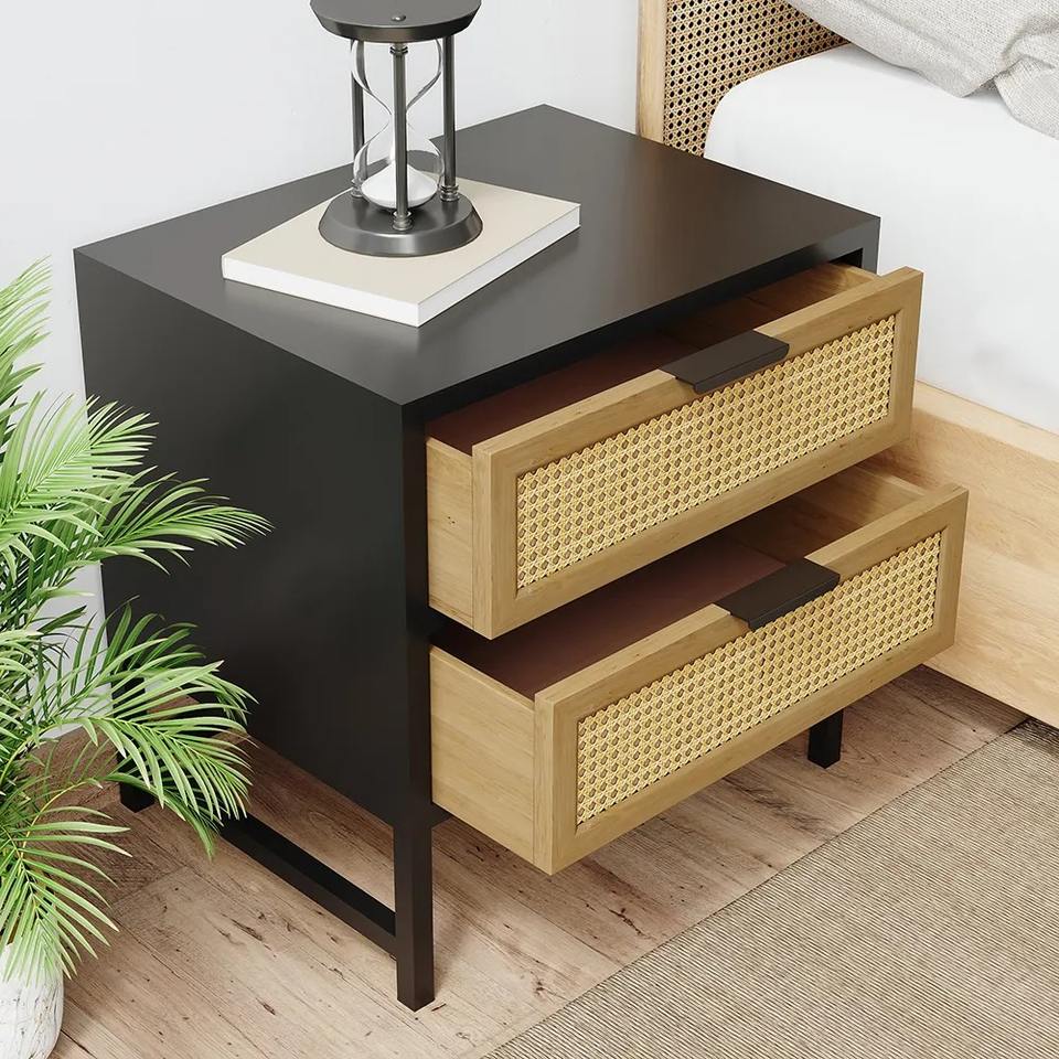 Meubles de chambre à coucher de style industriel moderne de qualité supérieure faits à la main Table de chevet en bois Table de chevet en rotin tissé 2 tiroirs End Home