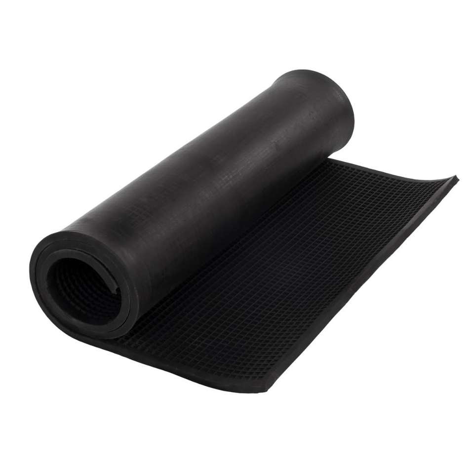 Table d'atelier industrielle avec rouleau de feuille de caoutchouc noir sur plan de travail métallique dans un environnement d'usine propre avec étagères à outils