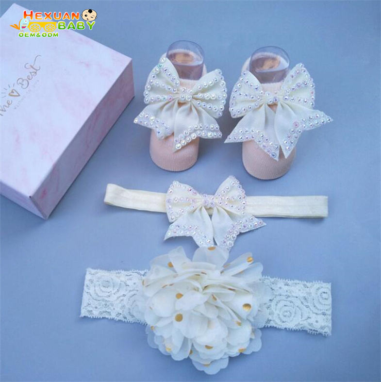 Chaussettes antidérapantes pour bébés filles, ensemble de 3 pièces, bandeau, cadeau, chaussettes pour les pieds, bandeau à dentelle en forme de couronne, accessoires pour photos
