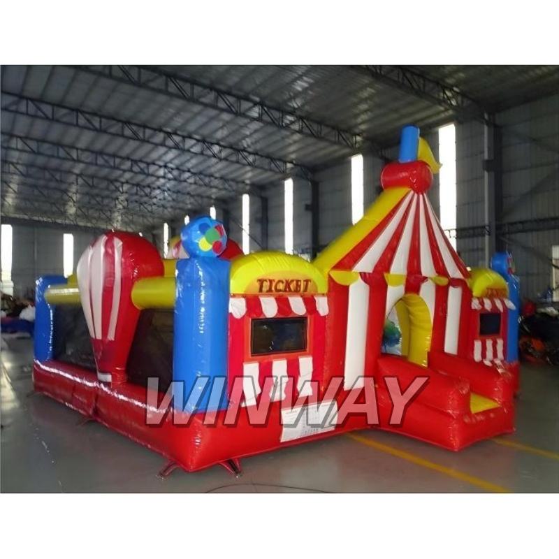 Château gonflable sur le thème du cirque avec guichet de billetterie, décorations de clown et de tente de cirque pour enfants