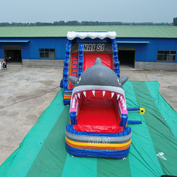 Grand château gonflable aquatique en forme de requin avec toboggan pour fêtes aquatiques