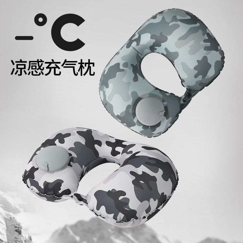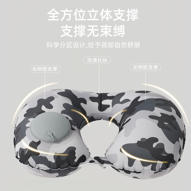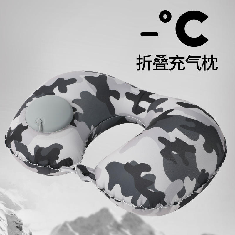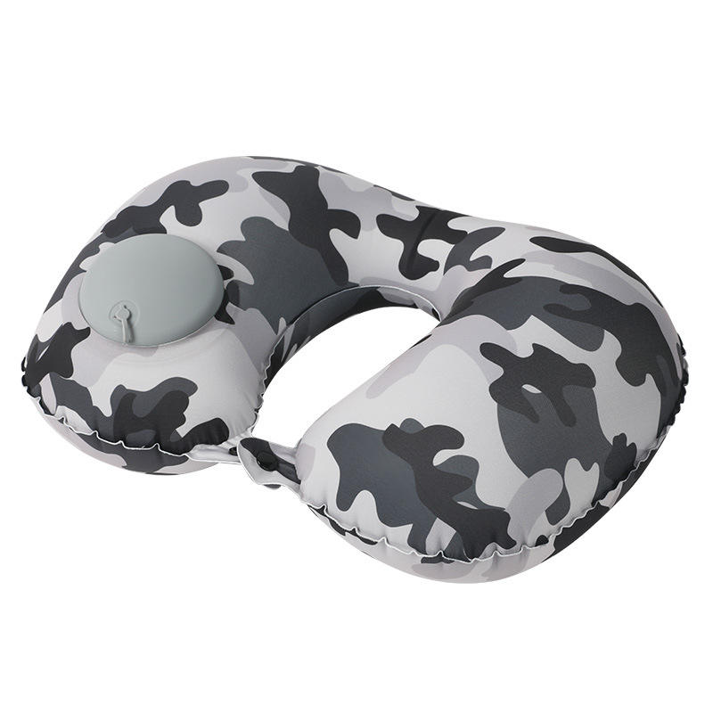 Oreiller de voyage gonflable en forme de U, gris camouflage, soutien du cou, oreiller portable pour le voyage avec sac de rangement et masque pour les yeux