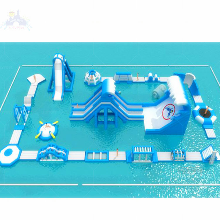 Équipement de jeu aquatique gonflable pour piscines et plages avec toboggans et parcours d'obstacles et jeux flottants