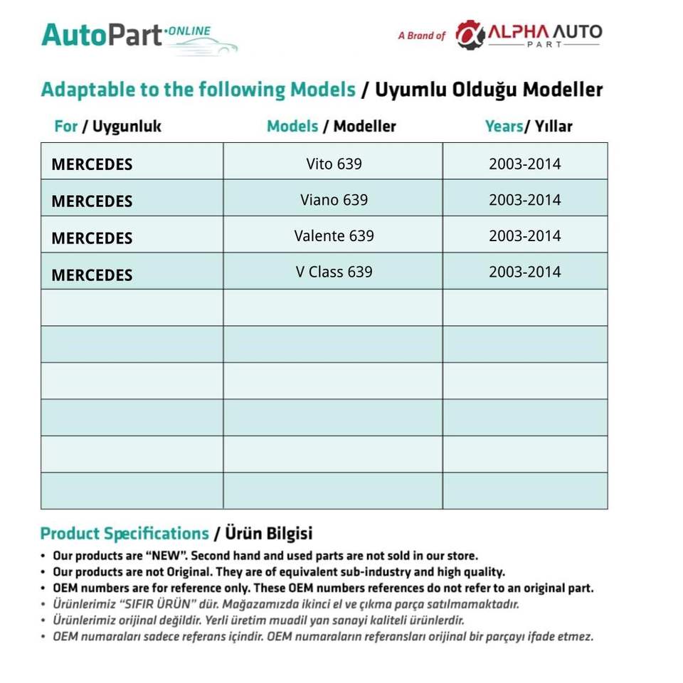 Fil d'ouverture intérieur pour Mercedes Vito, Viano, Valente 639 (expédition depuis le fabricant turc) Code produit: FD113922