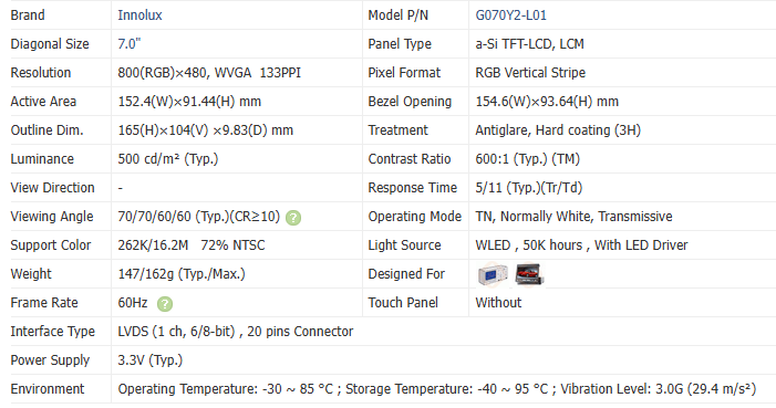 Module LCD Innolux 7,0 pouces 15:9 800x480 WLED Ultra Large, stockage -40 à 95 ° Module de remplacement C pour systèmes embarqués G070Y2-L01