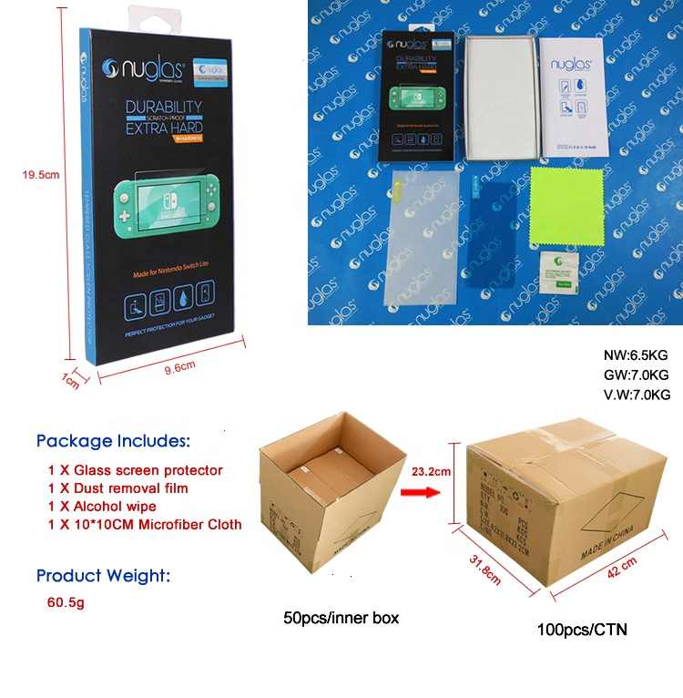 Paquet de vente au détail Nuglas; Paquet neutre sans aucune marque; Emballage personnalisé, détails d'emballage pour le protecteur d'écran en verre trempé: 10 pièces de boîte intérieure // 100 pièces de boîte extérieure.