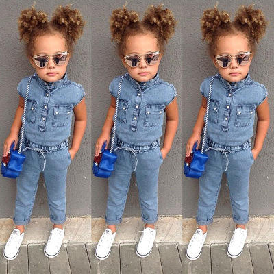Ins Hot SelI Popular Style Girls Clothes Denim Jumpsuit Cotton Bow Pocket Short Sleeves 2020 Kids Clothing in Wholesale