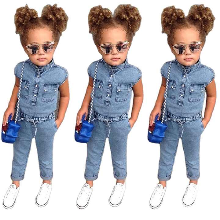 Vêtements pour filles tendance, style populaire, combinaison en jean, coton, nœud, poche, manches courtes, vêtements pour enfants 2019 en gros