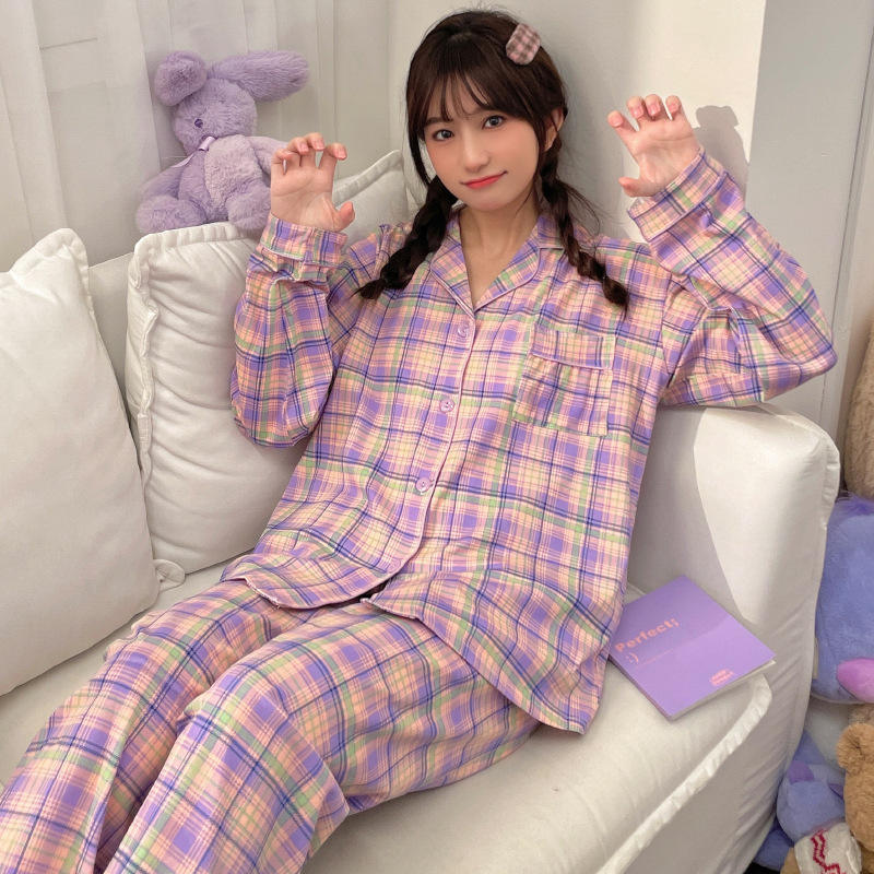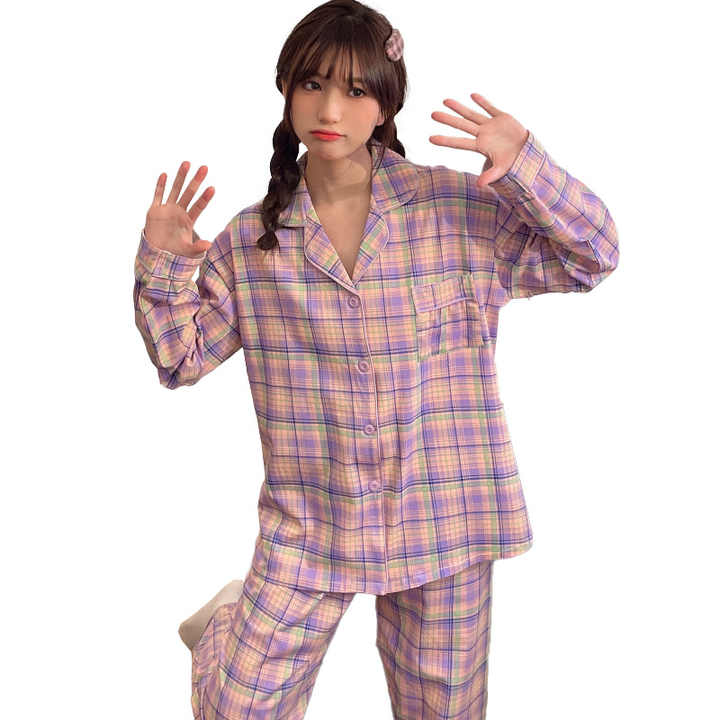 Ins Violet Plaid Pyjamas Printemps et Été Rétro Japonais Plaid Filles À L'extérieur Confortable Revers Homewear