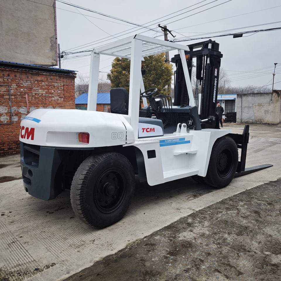 En stock, disponible à bas prix : Chariot élévateur TCM 90 % neuf, modèles TCM 80, 70, 50, 8 tonnes, 7 tonnes, 5 tonnes, avec mât à 2 ou 3 étages et déplaceur latéral.