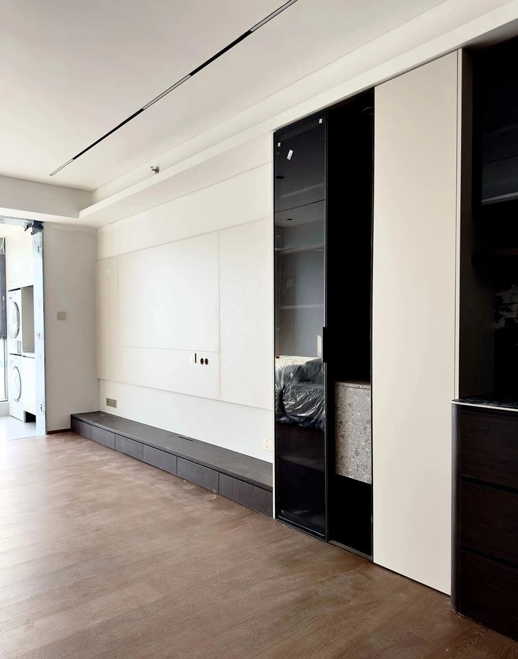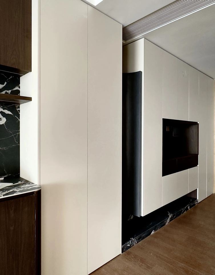 Meuble fonctionnel intégré pour entrée et salon avec étagères intégrées, éclairage dissimulé et aménagement modulaire