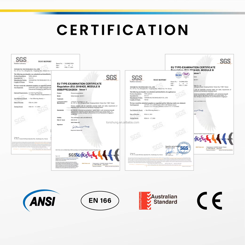 Certified with ANSI Z87+, EN166F, AS/NZS 1331.7I CE certification
