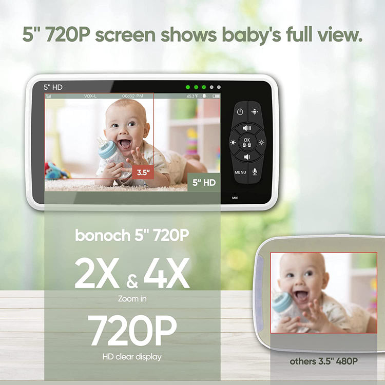 Babyphone intelligent avec écran sans fil, vision nocturne IR 30 m, écran LCD 5 pouces, rotation PTZ, alimentation CC, contrôle de la température à distance