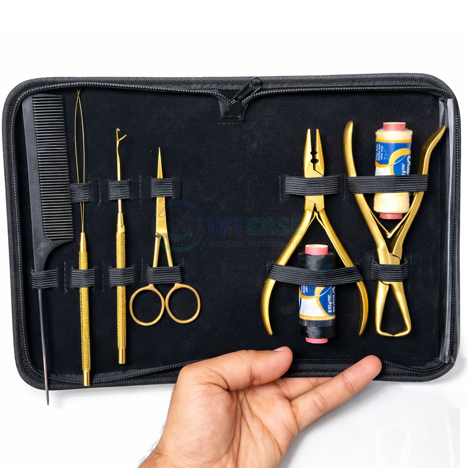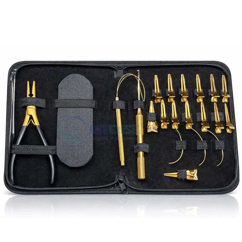 Kit d'outils de pose d'extensions capillaires plaqué or chirurgical intensif avec pinces et 12 clips premium pour usage professionnel haute précision