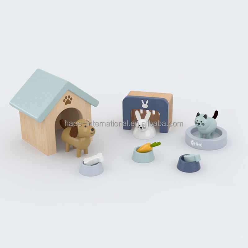 Jouet en bois interactif pour enfants, meubles pour bébés, animaux de compagnie, maison de poupée miniature DIY rose avec chien et chat