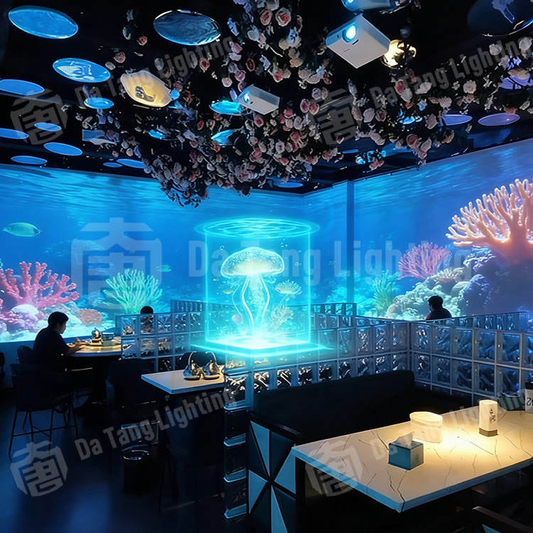 Système de projection immersive interactif pour zone de restauration thématique et espace événementiel avec design créatif