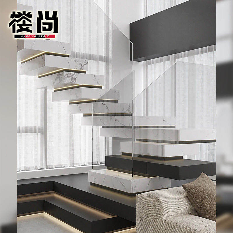 Escalier intérieur double à marches superposées en dalles de marbre de luxe léger, populaire sur Internet, pour maison auto-construite, villa duplex en verre, grenier