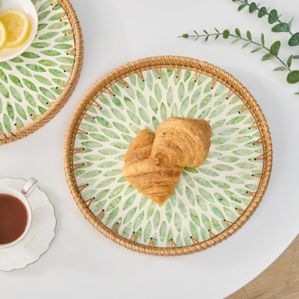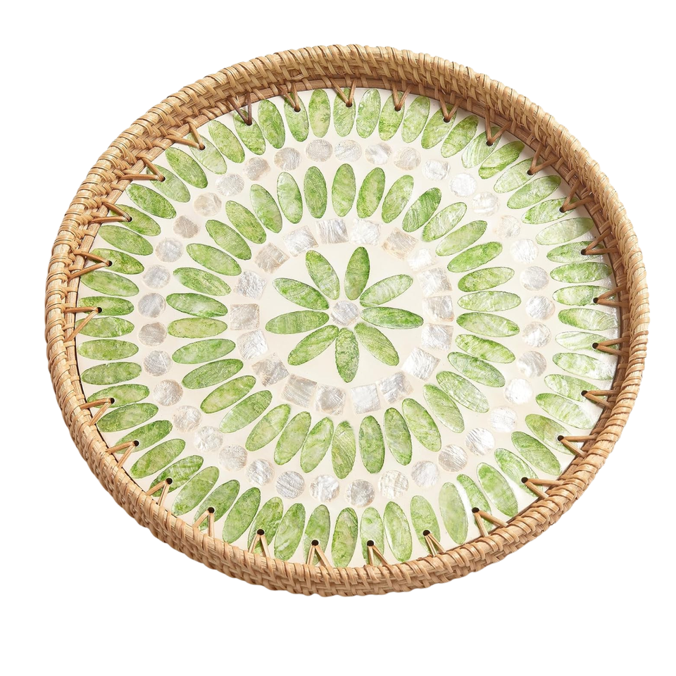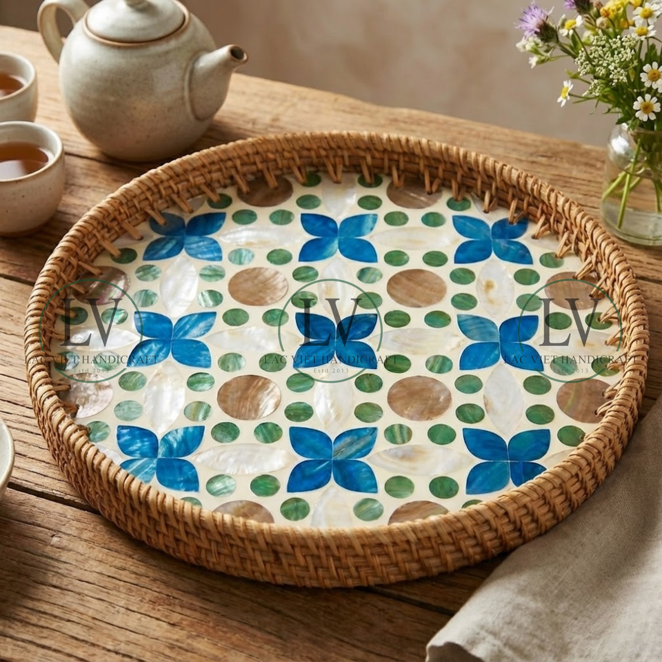 Plateau en nacre magnifique et complexe, plateau de service en rotin, plateau décoratif en nacre pour le Ramadan, l'Aïd, vente en gros au Vietnam