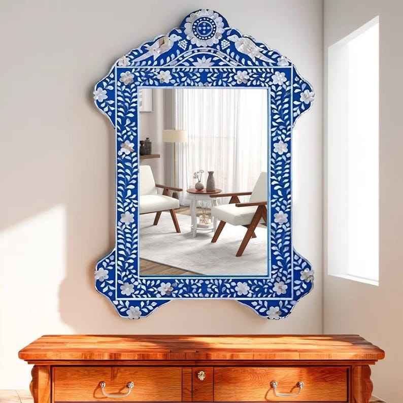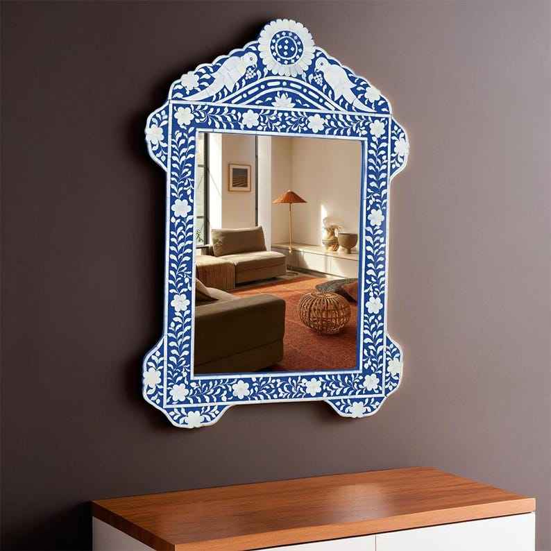 Miroir mural incrusté de nacre arrondie au design complexe miroir mural incrusté d'os fait main indien le plus vendu