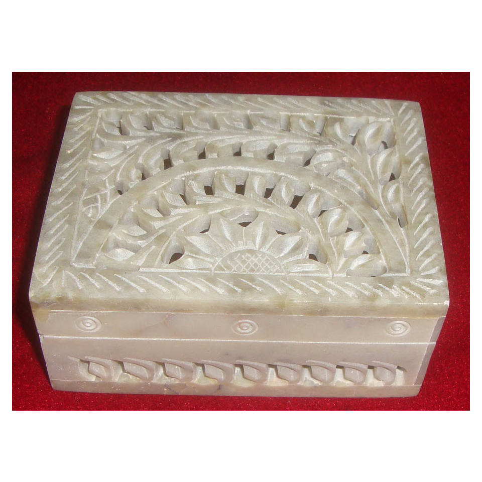 Boîte à bijoux en stéatite sculptée à la main avec motifs complexes, idéale pour les petites occasions.