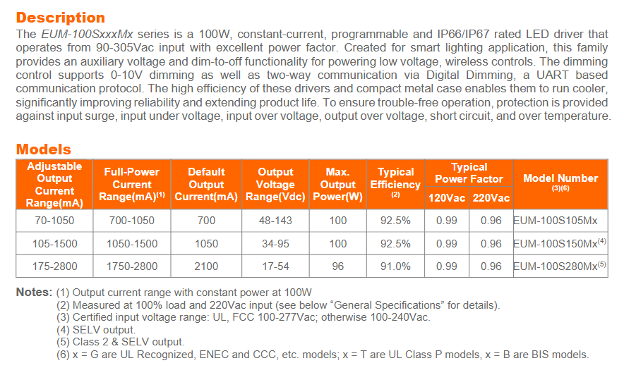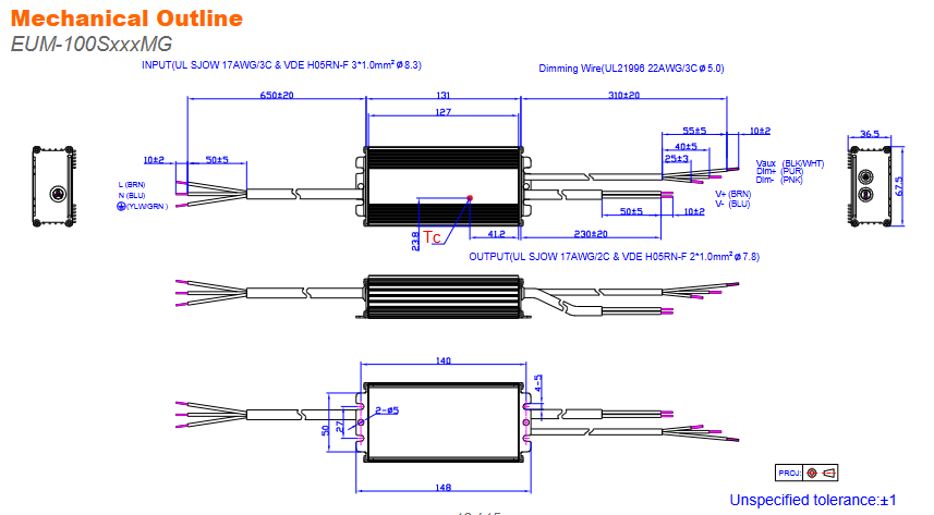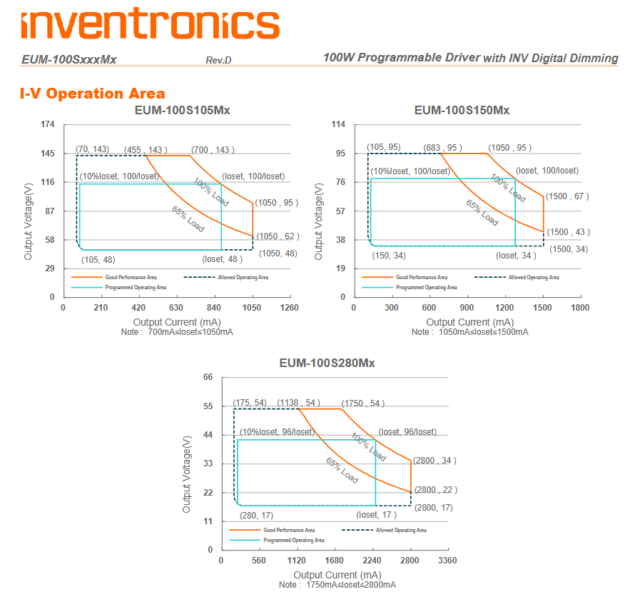 Inventronics EUM-100S280MG étanche AC-DC 0-10V Gradation DC17-143V 5 ans de garantie 100W Led Driver