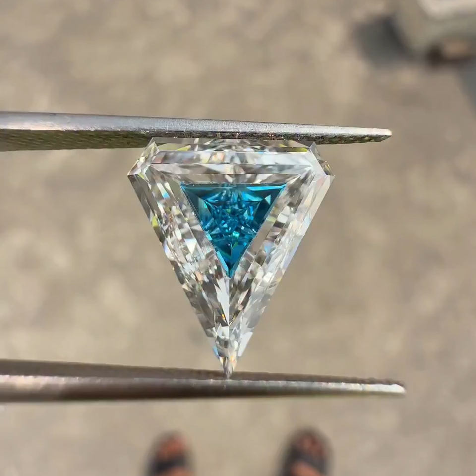 Diamant cultivé en laboratoire en forme de triangle inversé | Diamant taille trillion avec centre bleu | Diamant géométrique non monté pour bague personnalisée