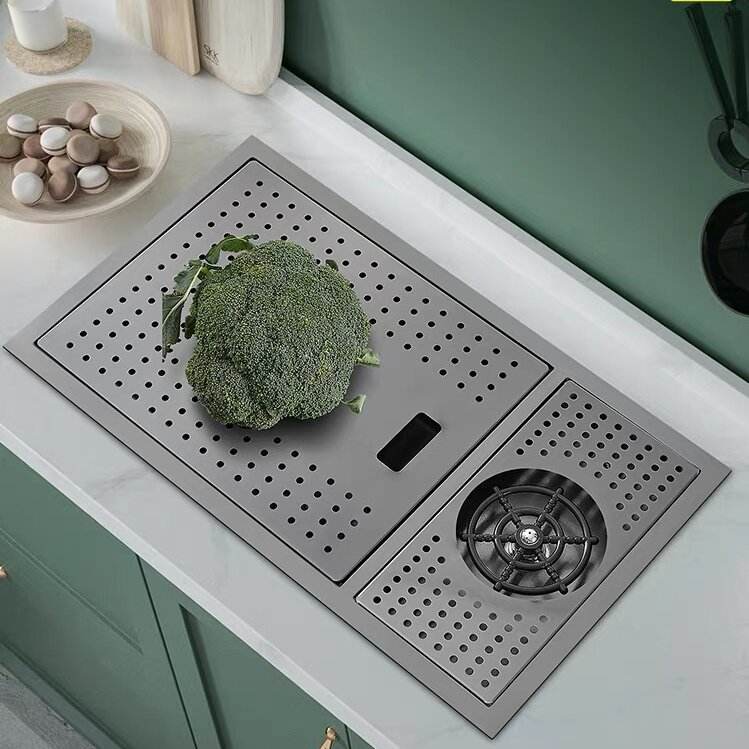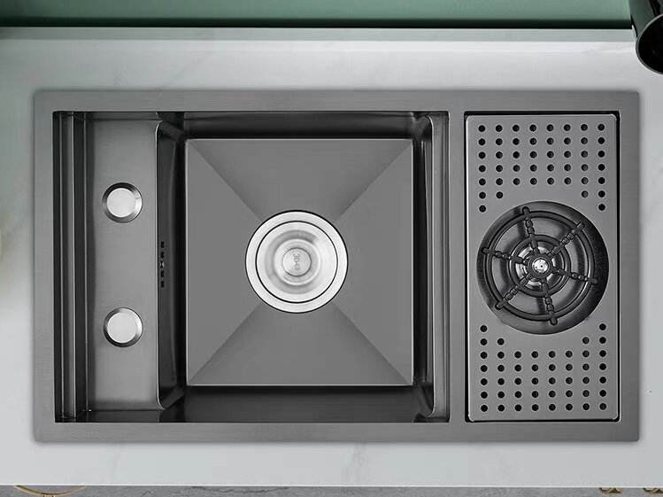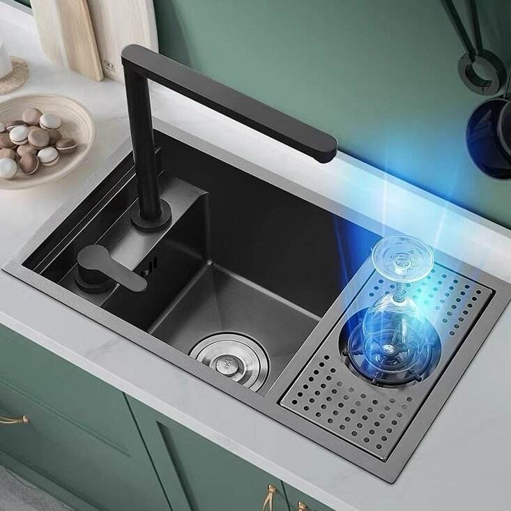 Évier de cuisine à cuve unique en acier inoxydable avec lave-tasses invisible intégré, pour comptoir de bar
