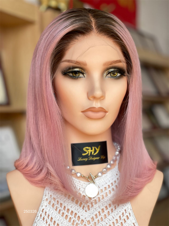 Nœuds invisibles 13A + salon de coiffure vierge crue couleur rose 14 pouces court Bob perruque cheveux humains HD dentelle 13x4 perruques frontales