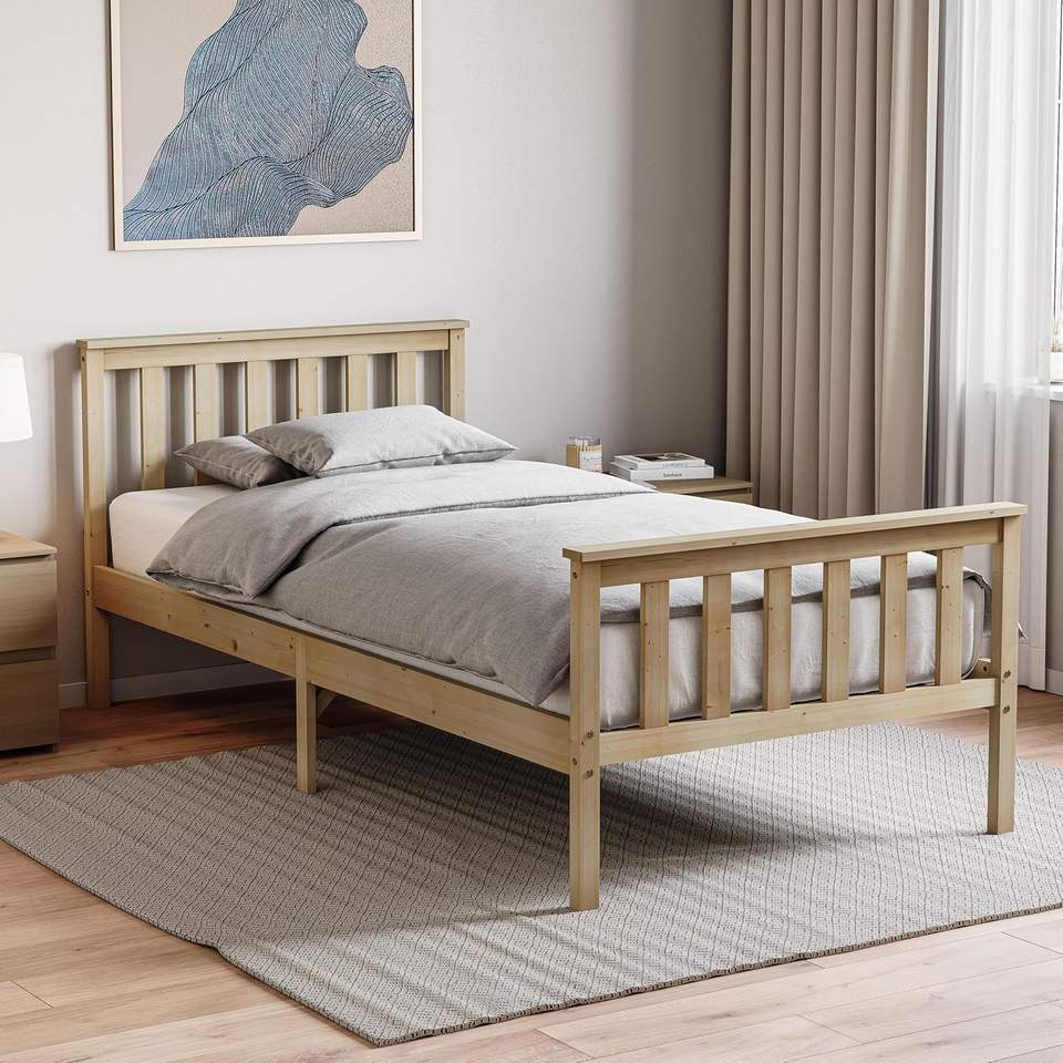 Lit simple en bois de pin massif de style moderne et design sophistiqué Inweto, avec tête de lit de 3 pieds et pied de lit haut pour la chambre à coucher, naturel