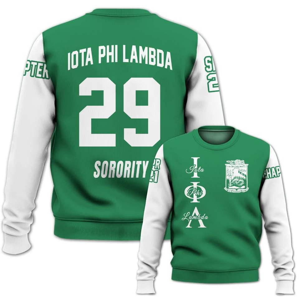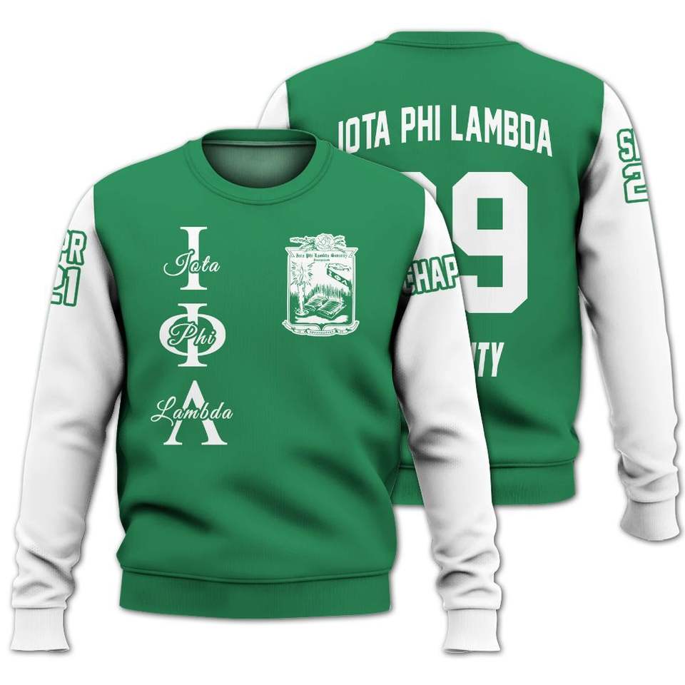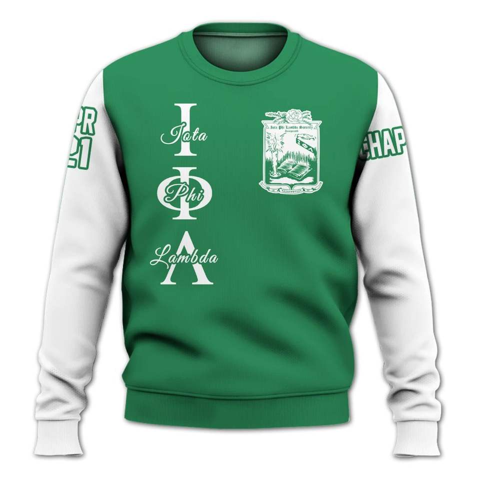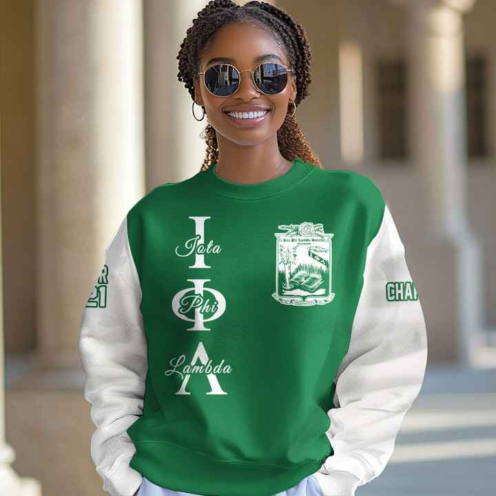Sweat-shirt universitaire personnalisé Iota Phi Lambda, vert émeraude et blanc, avec le blason de la sororité grecque depuis 1929, pull personnalisé