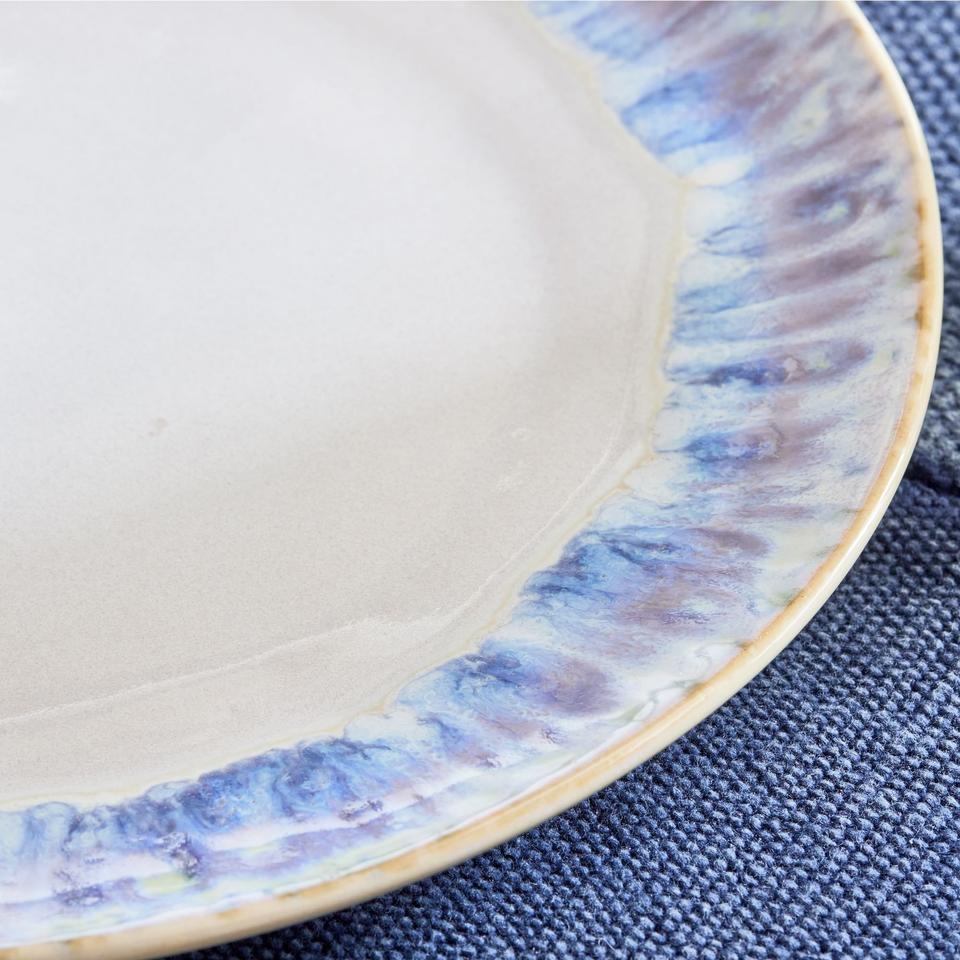 Assiette à dîner en céramique bleu irisé avec bordure, détails de glaçure artistique, forme ronde élégante, finition durable pour la salle à manger contemporaine