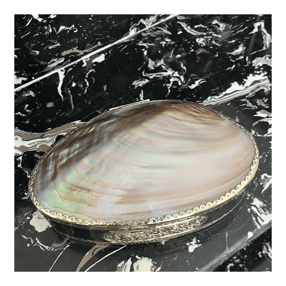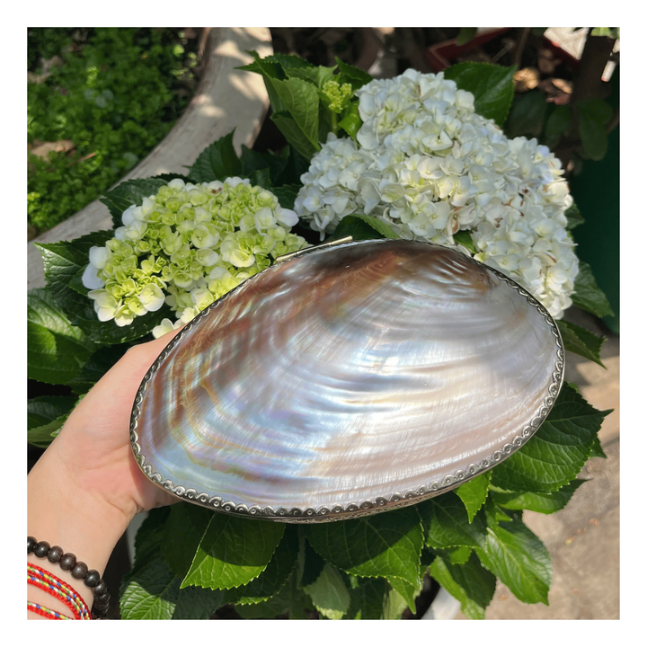 Boîte à bijoux en coquillage irisé, boîte à accessoires ovale exotique en coquillage, finition naturelle en nacre, étui vintage à reflets arc-en-ciel