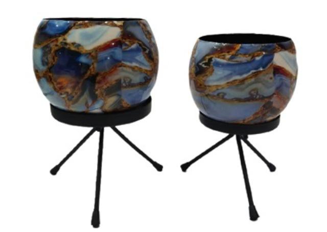 Jardinière en métal blanc avec motif floral bleu et support trépied, pot de plante décoratif pour la maison, l'hôtel, le bureau, le salon