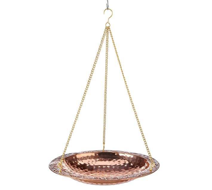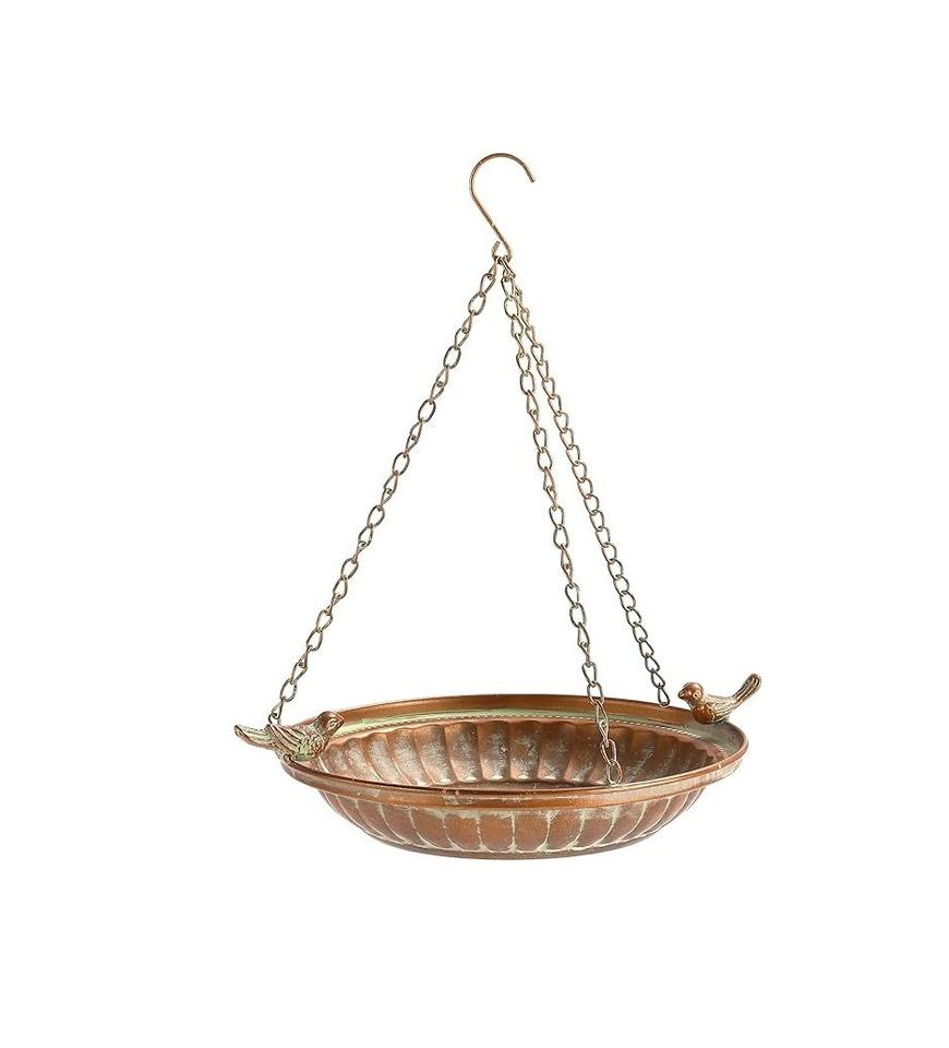 Bain d'oiseaux suspendu en fer avec deux oiseaux sur le rebord, bol rond, suspension à chaîne, éclairé, prix de gros