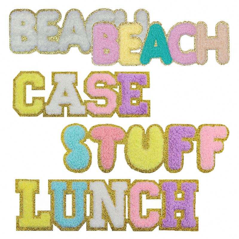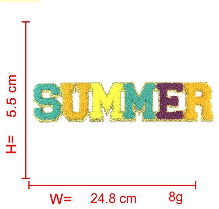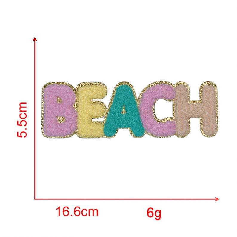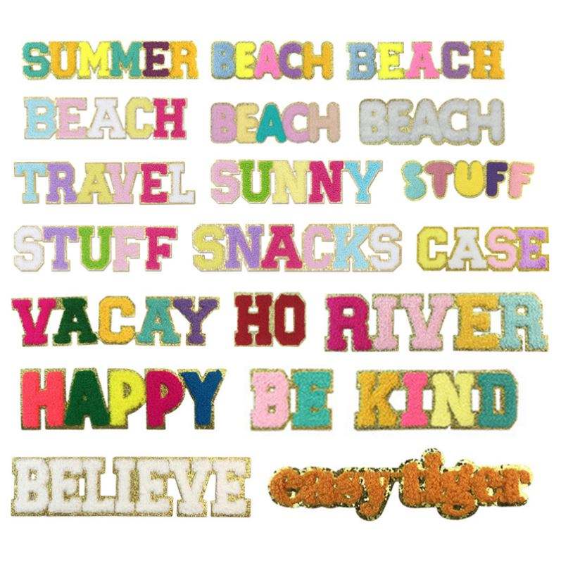 Patch thermocollant en chenille à bords dorés fins et colorés, avec motifs 'Words', pour la décoration de vêtements, sacs, boîtes à lunch et sacs de plage