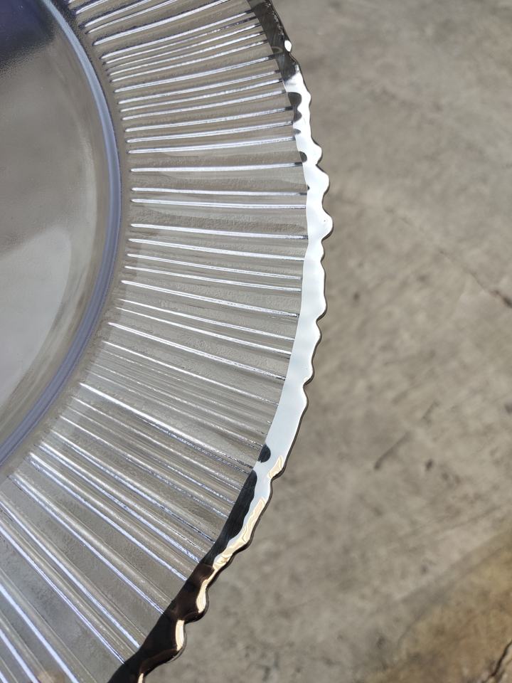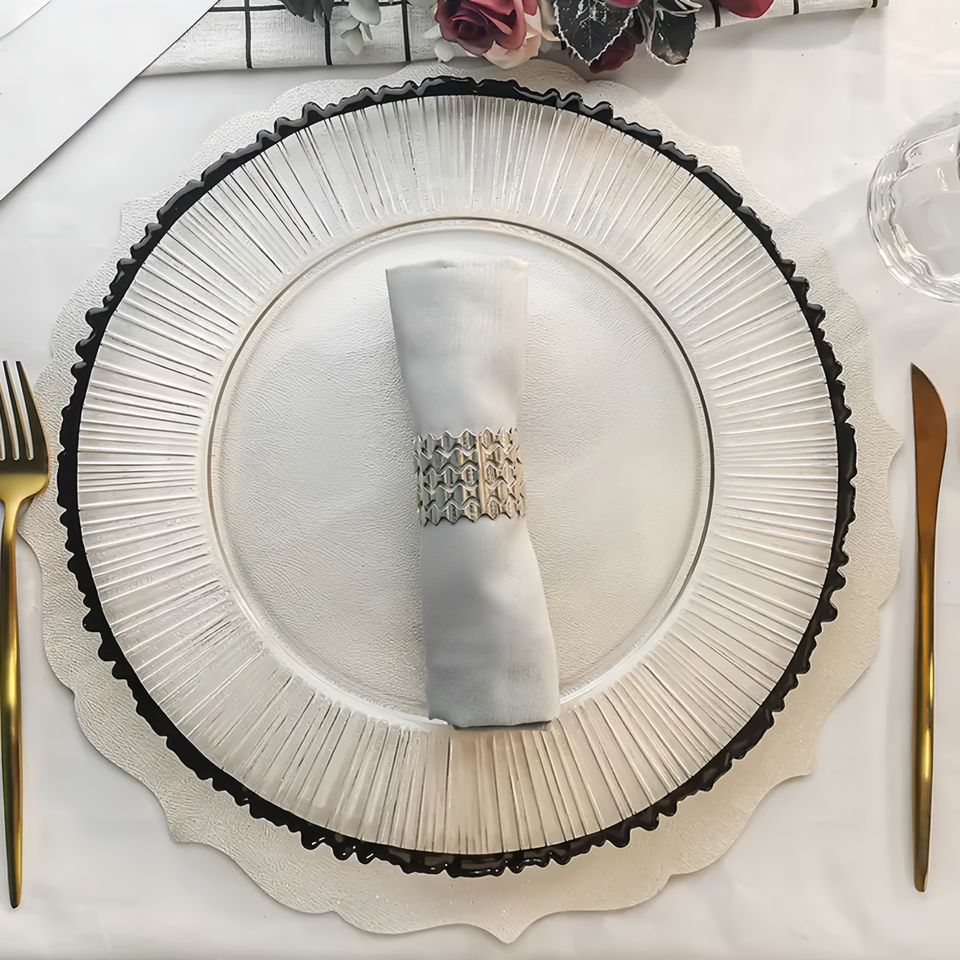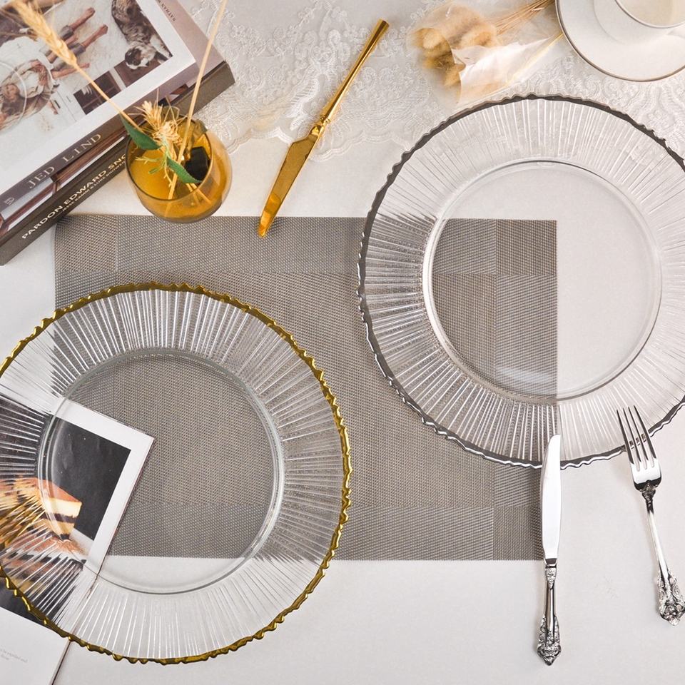 Assiette de présentation en verre transparent à bord doré irrégulier, avec garniture argentée, pour mariages et événements