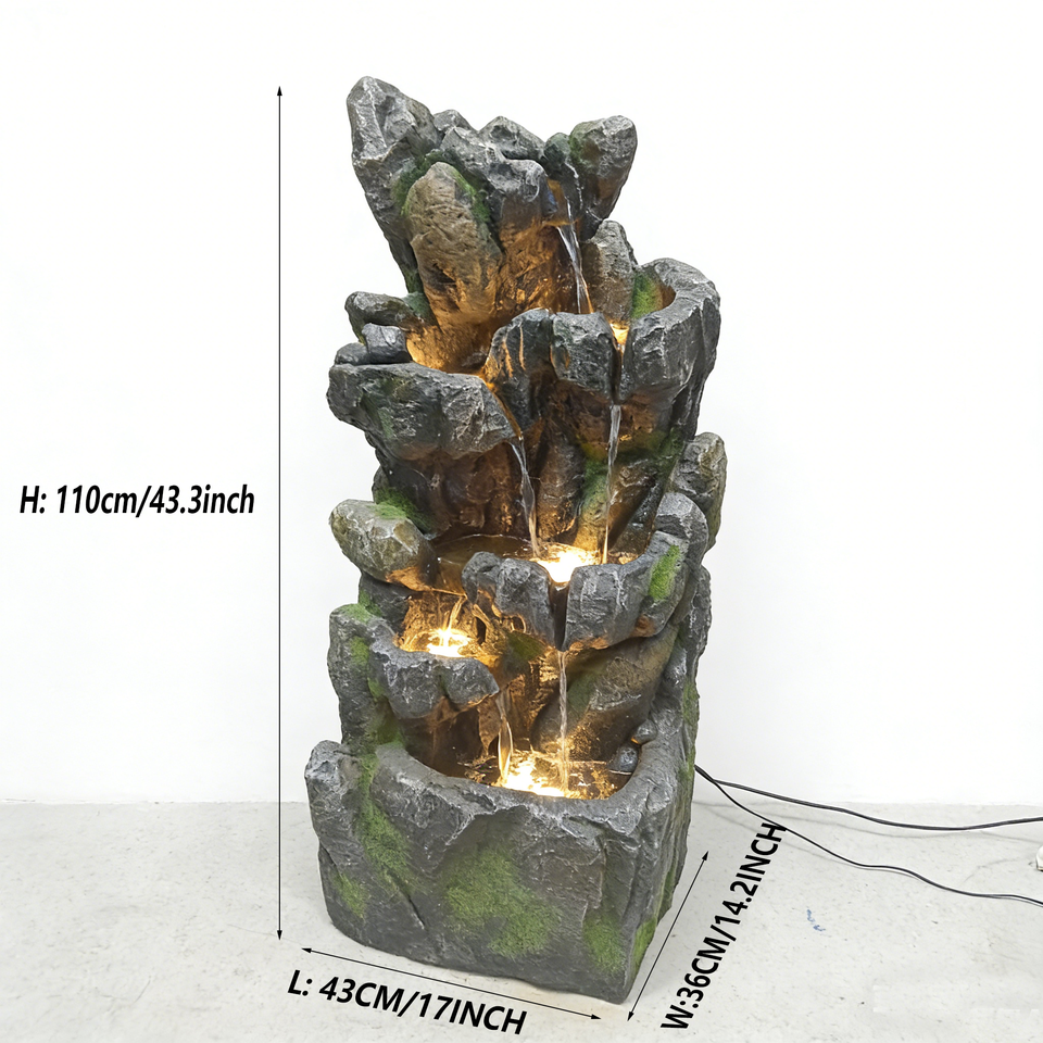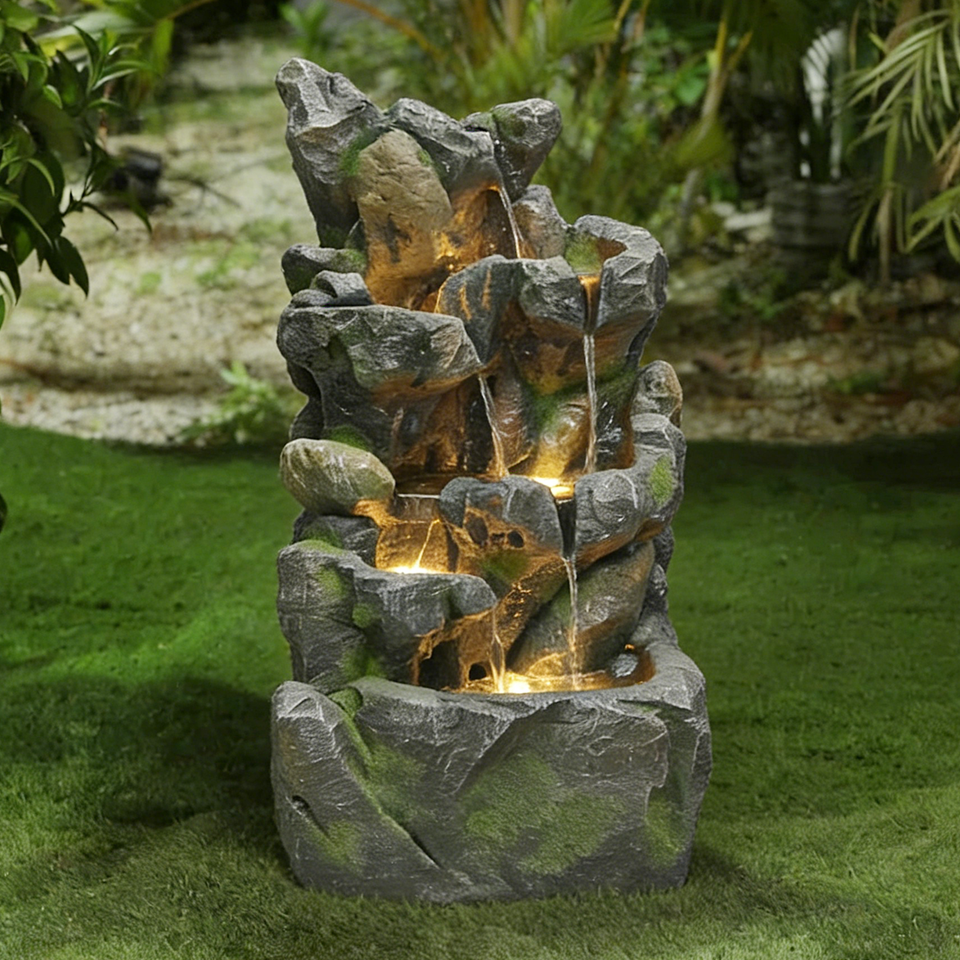 Fontaine d'eau moderne en fibre de verre imitation pierre irrégulière avec cascade lumineuse pour jardin, cour et extérieur