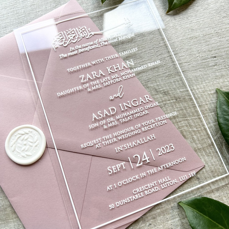 Islamic Calligraphy Muslim 1mm or 2mm Acrylic or 0.5mm PVC Invites Personalised Custom logo Wedding Invitations with Envelope