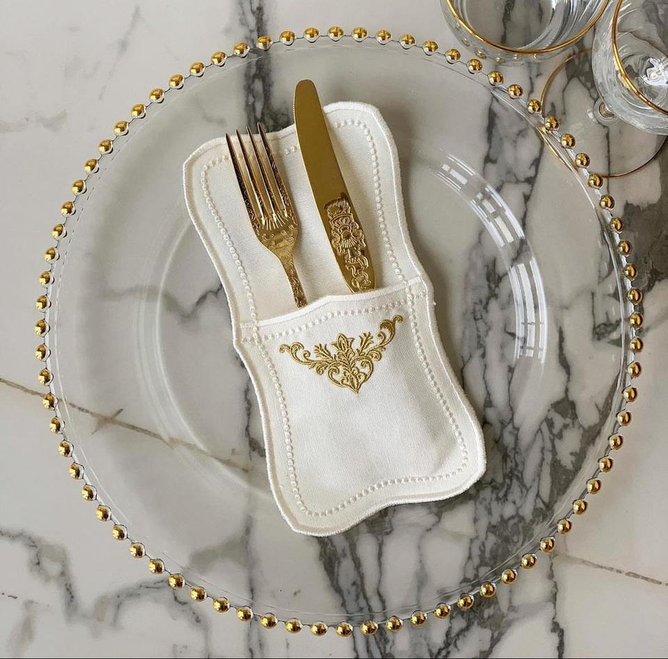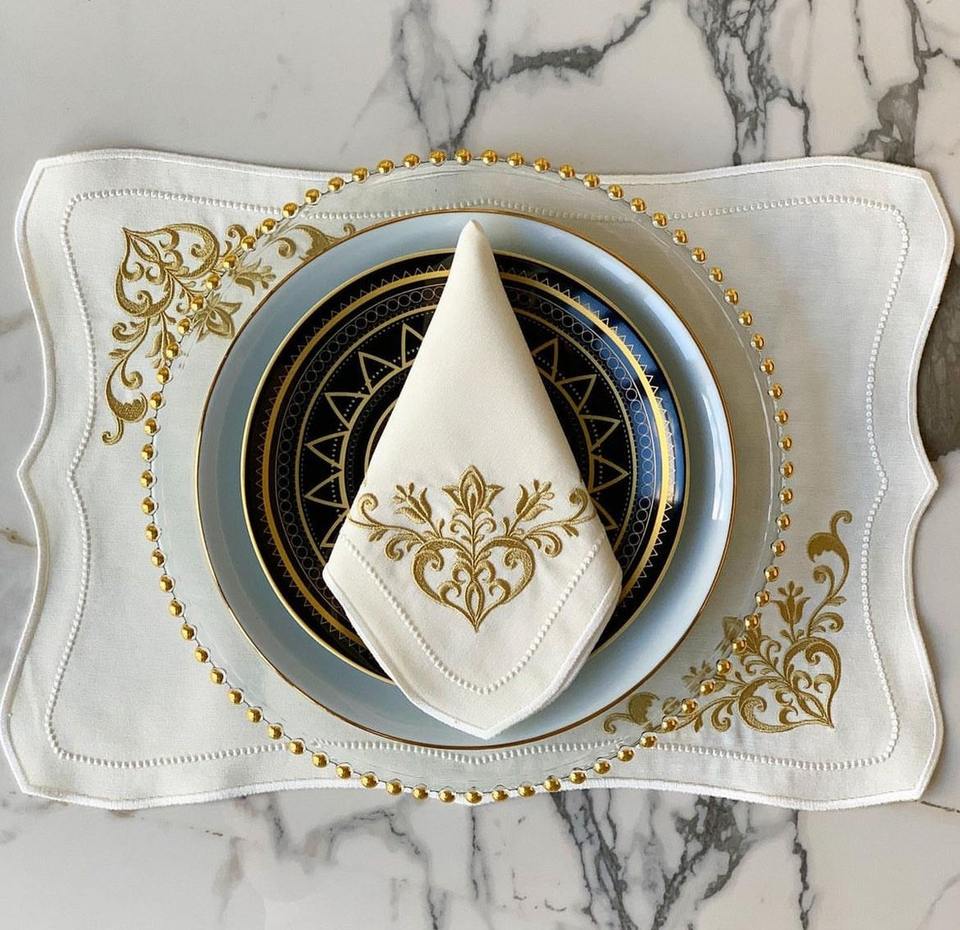Ensemble de napperons imperméables pour le Ramadan, pochettes à couverts en coton écologique brodé or islamique Accessoires de serviettes en tissu pour taches