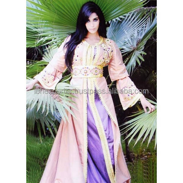 Caftan moderne islamique deux pièces pour femmes avec combinaison rose et violet avec broderie sur le dessus et les manches avec ceinture