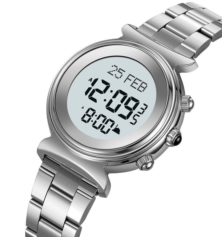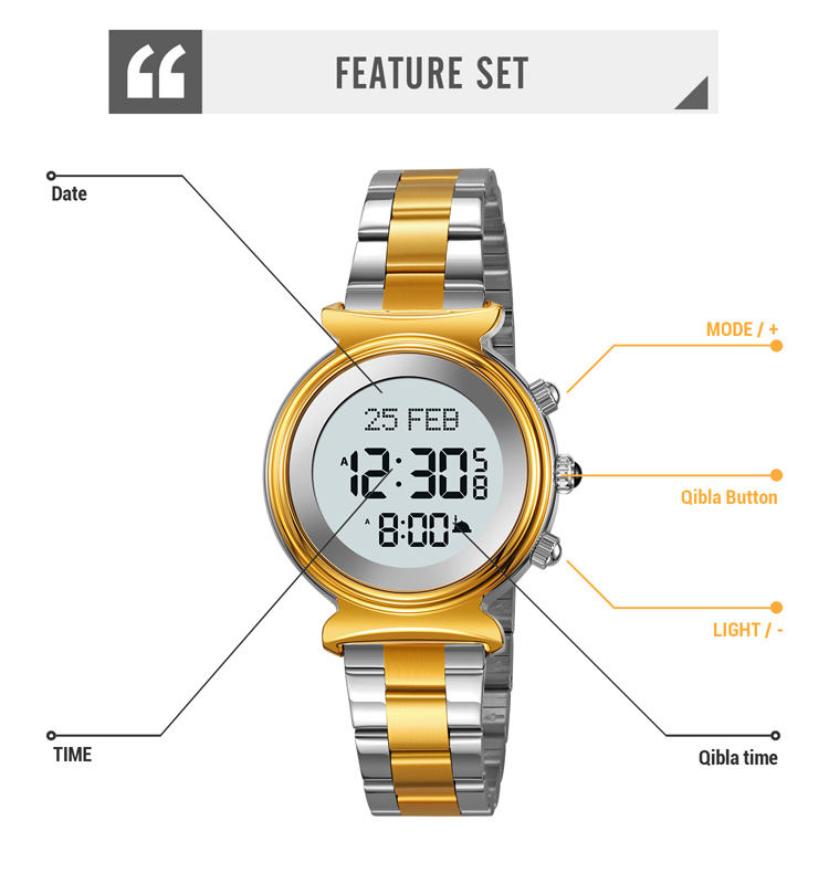 Rappel de temps de pèlerinage, affichage du nom Qibla, Qibla Direction, mois religieux, jour religieux, calendrier grégorien, calendrier Hijri, données de la ville, heure d'été, signet, sélection de la langue, chrono, alarme, réglage du volume, date, semaine, temps restant de la batterie, lumière LED, horloge 12/24 heures.Dispositif