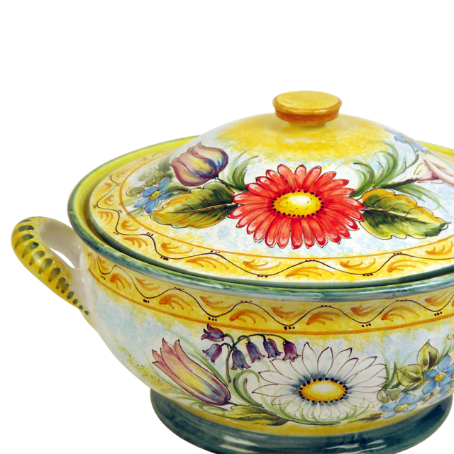 Italian Handmade Pottery Flower Decoration Botanical Design Ceramic Round Soup Tureen with Lid