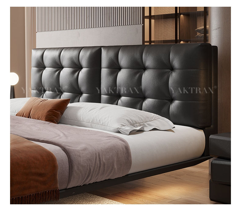 Lit de conception italienne inspiré des nuages, en cuir noir mat, inclinaison manuelle, base de soutien cachée, chambre principale moderne