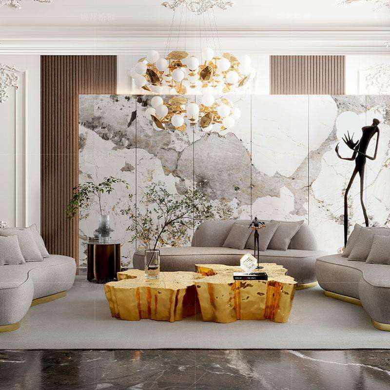 Table basse moderne haut de gamme de style italien, luxe léger, en marbre irrégulier et acier inoxydable, design racine d'arbre, pour maison et villa