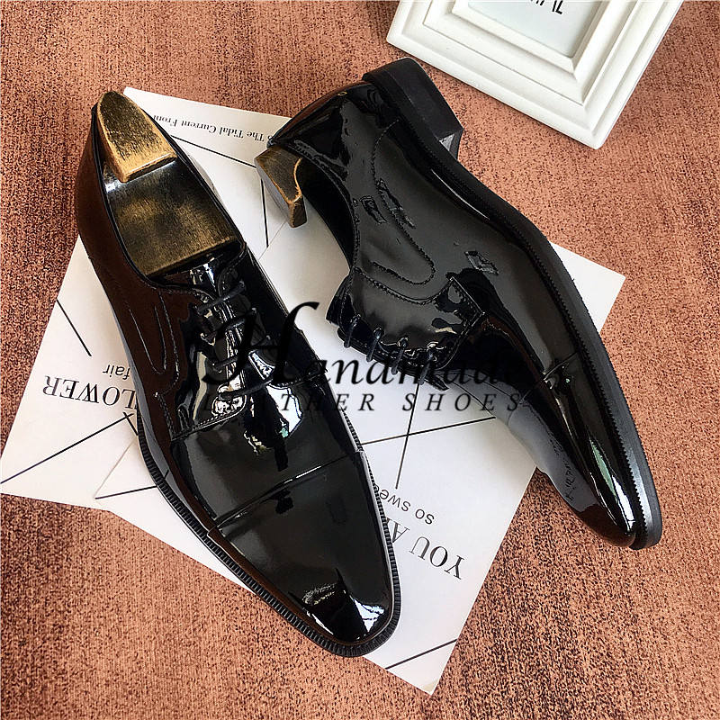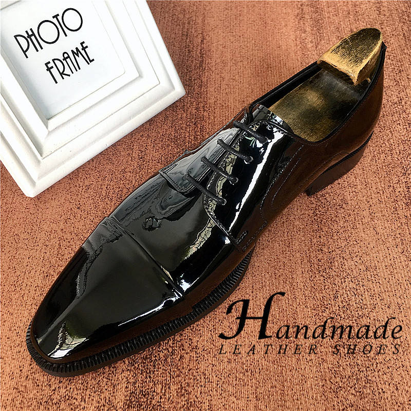 Chaussures derby italiennes pour homme, en cuir véritable fait main, haut de gamme, trois pièces, avec surface en cuir laqué brillant.