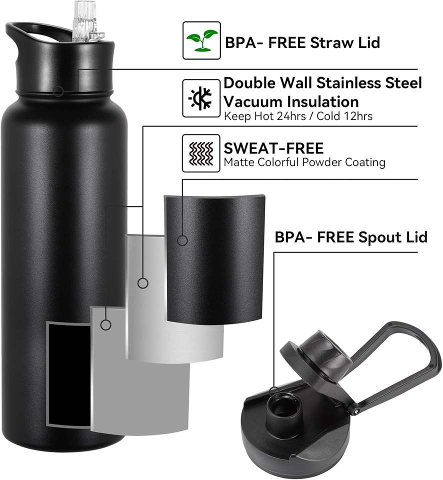 Bouteille d'eau sport isotherme à double paroi en acier inoxydable écologique à large ouverture, nouveau couvercle, couleur personnalisée, 12-128 oz
